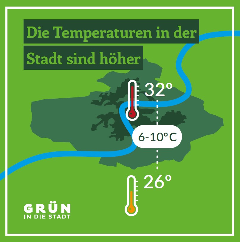 Die Sommer werden immer heißer, Hitzeperioden häufiger und länger. Diese Entwicklung ist vor allem für Städte eine Herausforderung. Denn hier trifft die Erderwärmung auf immer mehr Versiegelung. Die Folge: Das Stadtklima heizt sich immer stärker auf. So ist es in der Stadt im Sommer schnell bis zu 10 Grad wärmer als im Umland.
